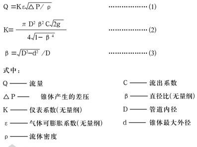 ? ? V型錐式流量計是一種差壓式流量儀表。它是通過在密閉管道中心線懸掛一個特制的流線型錐體來進行中央節流,用管道上游和錐體尾部測量的差壓值計算管道中的流量。其原理是基于封閉管道中能量相互轉換的伯努利定律,也就是說對于穩定的流體,管道中流體的流速與差壓的平方根成正比,當流體通過錐體節流區時,流速會加快,錐體下游尾部的壓力降低,產生了差壓。利用流體的連續性方程和伯努利方程,即可推導出被測流量與輸出差壓值的數學關系式。連續性方程是能量守恒定律應用于運動流體的一種數學表達式。